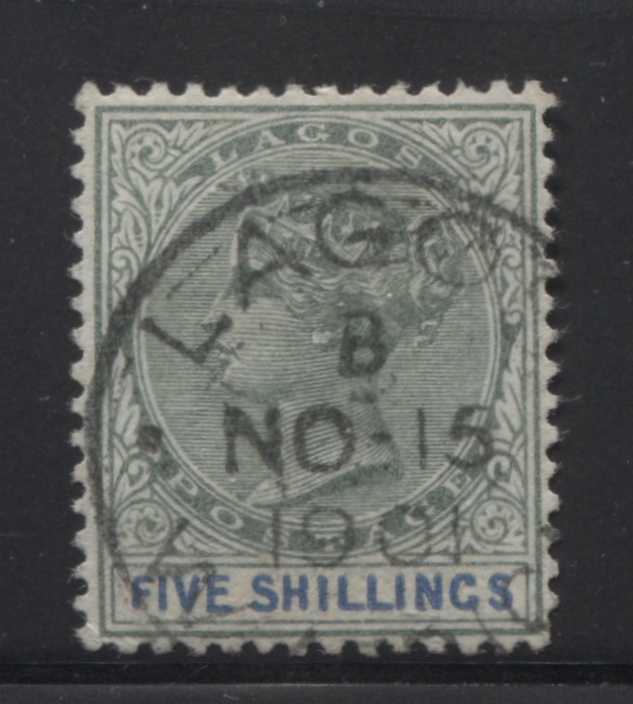 This sole used example is canceled with a nice strike of a Lagos CDS, dated November 15, 1901. It appears to be somewhere between 23 and 24 mm wide, which would make it from a subsidiary post office, as those of the Lagos GPO were always 24 mm wide.