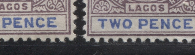It would appear that the duty plates used to print the 2.5d value were the same as those used to print the previous Queen Victoria stamp, because the same size type differences that we saw there occur on this stamp. Only this time, the differences are, in my opinion, easier to see on this stamp, than they were on the earlier issue.