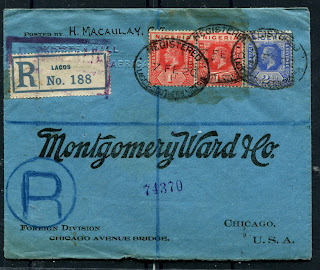 Now why was he sending it? You have to know who Montgomery Ward is to know the answer. Montgomery Ward was a mail order department store that was established in 1872 in Chicago, Illinois, that went bankrupt in 2001. It did a lot of business in West Africa from the late 1910's all the way into the 1950's, and probably later. Its just that all the many covers that I have addressed to it seem to fall within that time period. At the beginning of the 1900's Montgomery Ward was the main competitor to Sears Roebuck & Co. Reading many of the letters written by Nigerians during this time would lead one to conclude that many Western clothing items and personal items like toothbrushes, combs, toothpaste, socks, matches, underwear, shoes etc., were not widely available in Nigeria. So, in all likelihood Macaulay was probably ordering a suit, or a pair of shoes, or something similar.