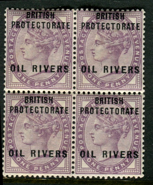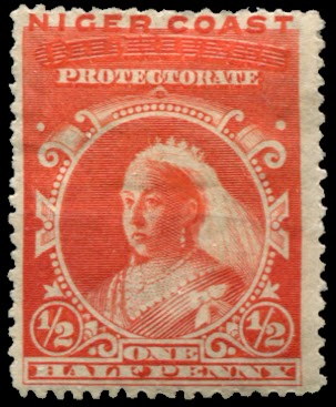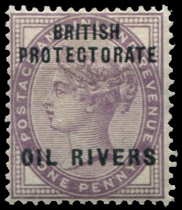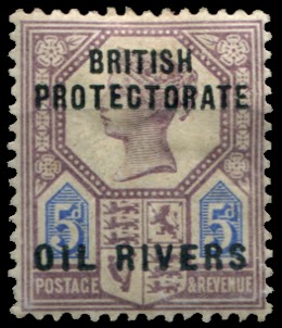 The overprinted issues of Great Britain, first appeared on July 20, 1892, and continued in use until the beginning of 1894. So they were in use for a little under a year and a half. There were five denominations: the 1/2d vermilion, the 1d lilac, the 2d grey-green and carmine, the 21/2d purple on blue, the 5d dull purple and blue, as well as the 1/- dull green. The overprint consisted of the words "British Protectorate" and "Oil Rivers" in three lines, with two appearing at the top of the design and the third line appearing at the base. The first five designs appear as follows: