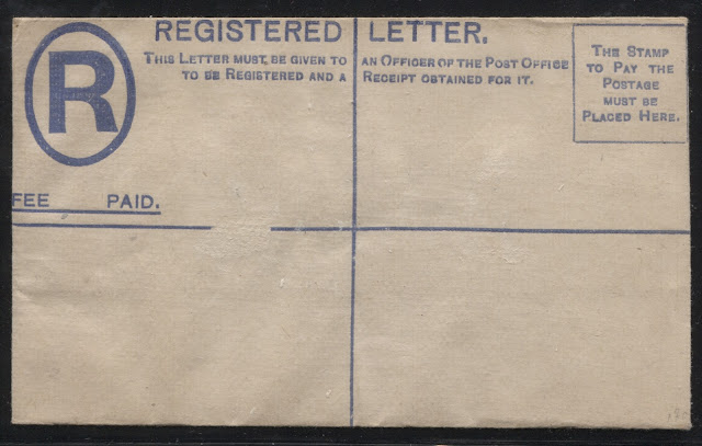 I have a series of mint registered envelopes, which appear to have been produced in 4 different sizes, and with slightly different information on the back in regards to registration fees. The first larger types are 96 mm wide and between 147 mm and 150 mm long. The front and back of each type both appear the same and are shown below: