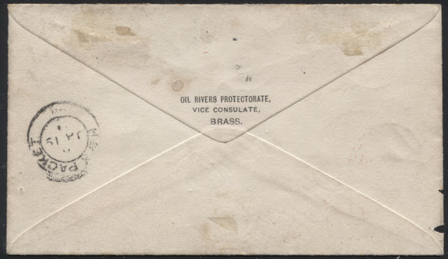 This cover may be philatelic, but on the other hand, the 1d stamp has a missing corner, which would very likely not have been the case on a philatelic cover. The back of the envelope shows that it was sent from the Vice Consulate in Brass, which does suggest that it may well have been commercial in nature. Interestingly, there are no registration markings on the envelope.