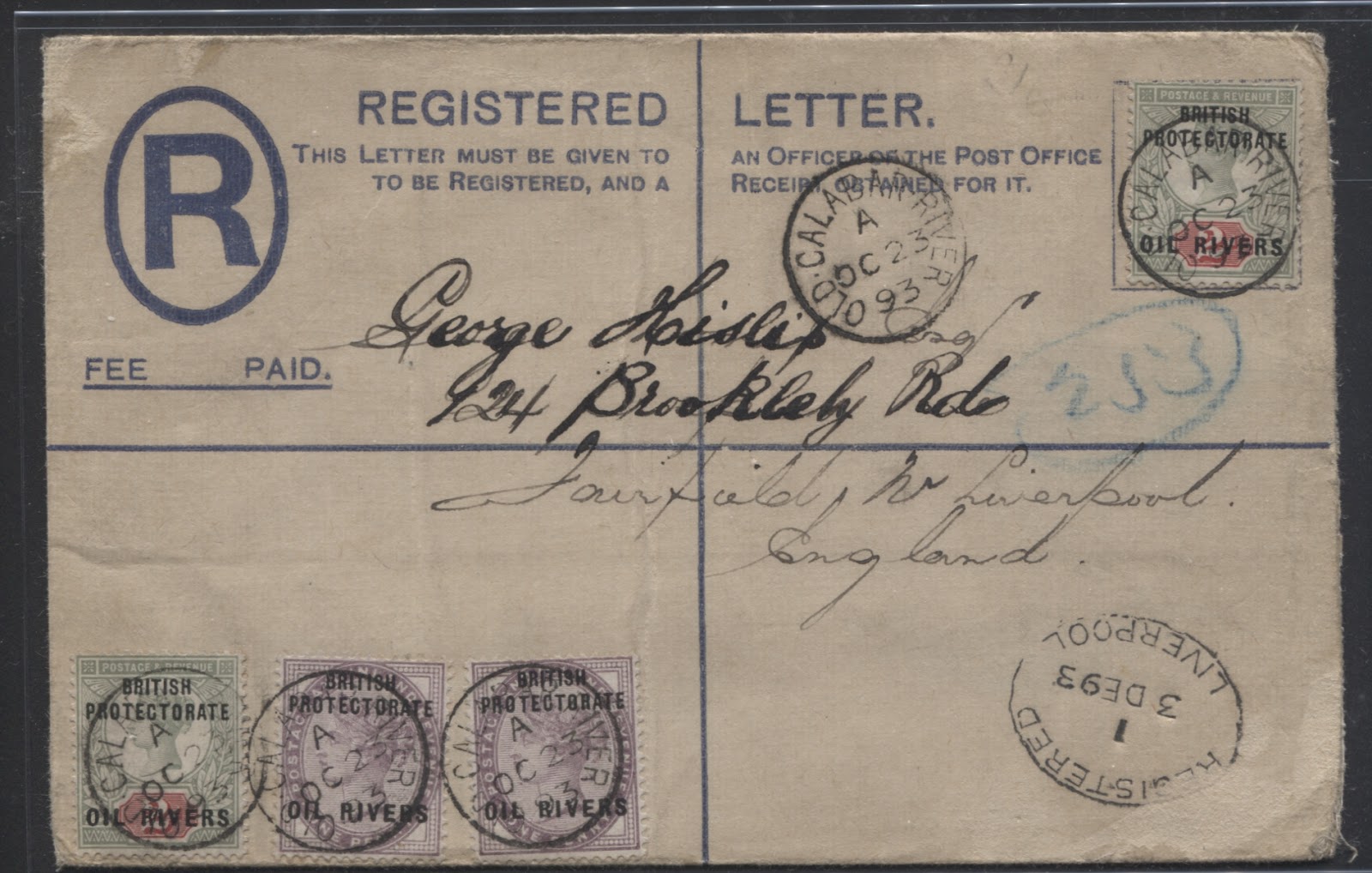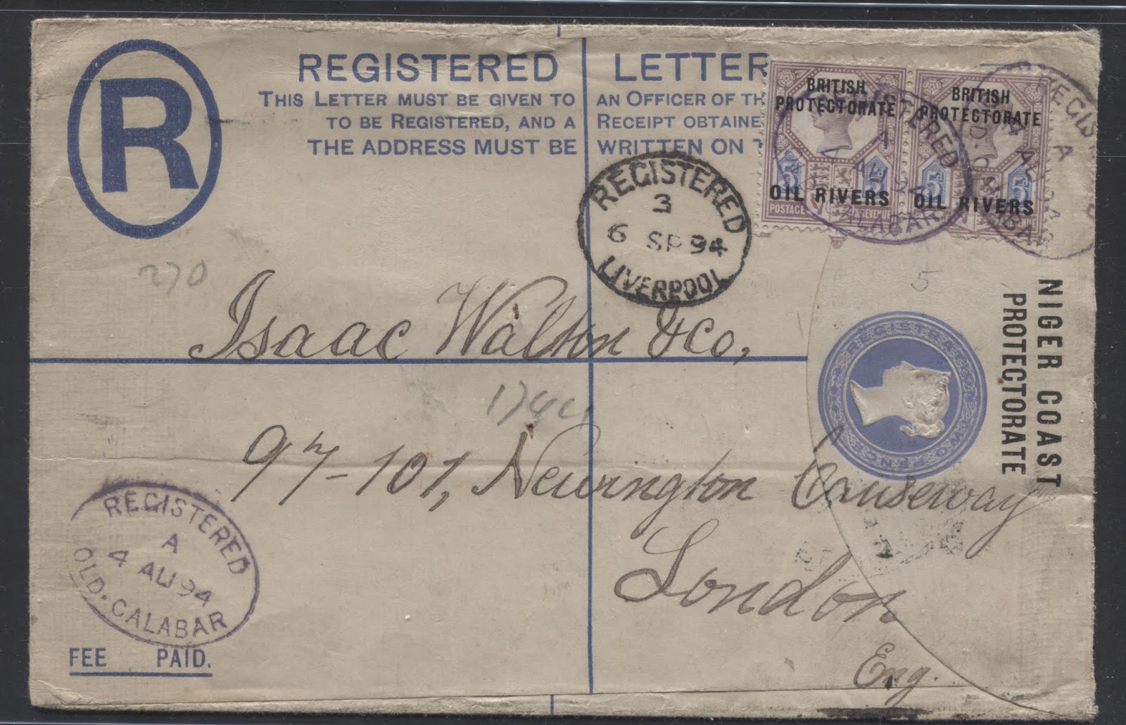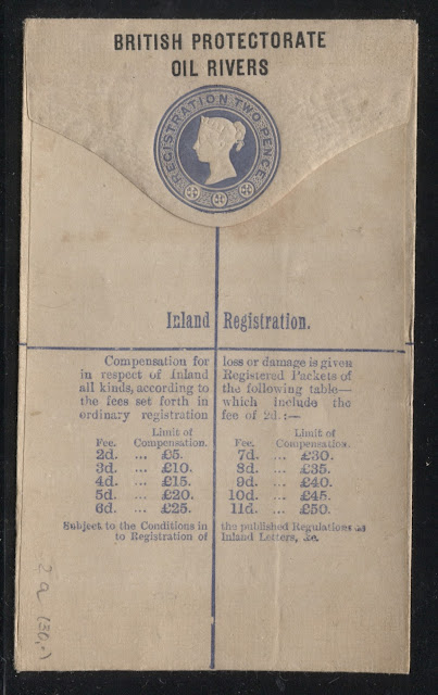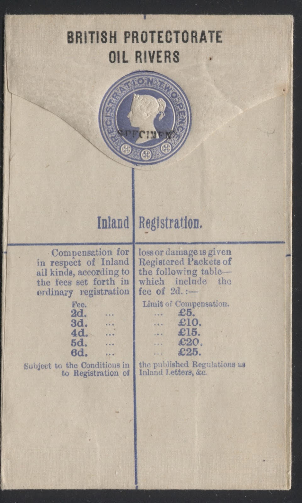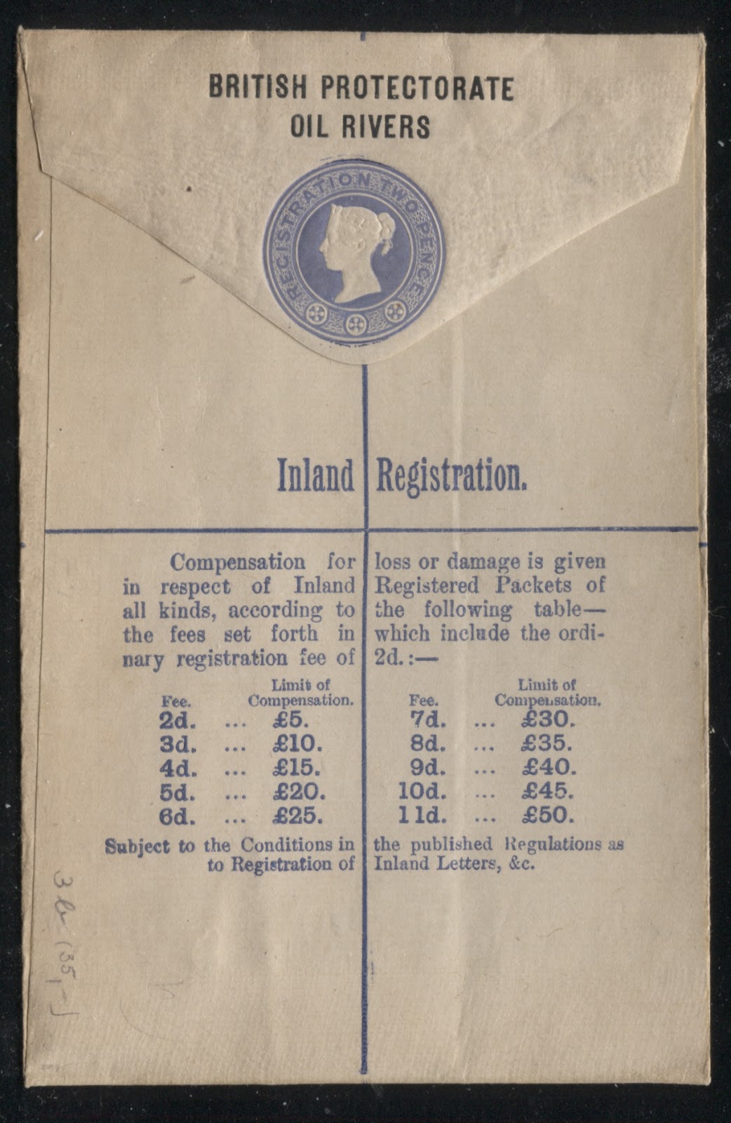 This is a standard Great Britain envelope which has been overprinted for use in the Oil Rivers. You can tell by the lack of a country name in the stamp indicta on the back knife. These envelopes show the registration fees up to 11d for 50 pounds of coverage.