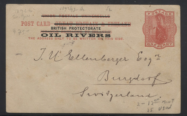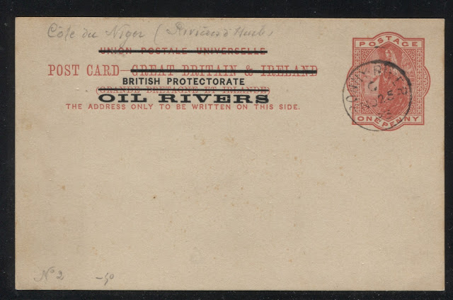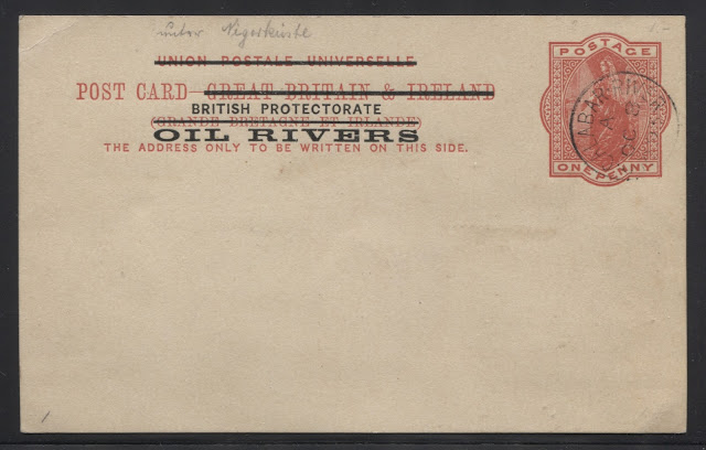 I have a group of Great Britain postcards, to which an overprint has been applied to indicate that they were to be used in the Oil Rivers. All except one of the cards are the 1887 scarlet Jubilee design, and were likely intended for foreign use. The sole 1/2d card that I have was likely intended for local use. Only one of these cards is addressed, but there are no mail markings of any kind on it, so that it is not clear whether or not it was actually sent to its destination through the postal system. Two of the cards are mint and two bear CDS cancellations for Old Calabar River and Bonny River, but are otherwise completely unaddressed. The cards are shown in the scans below:
