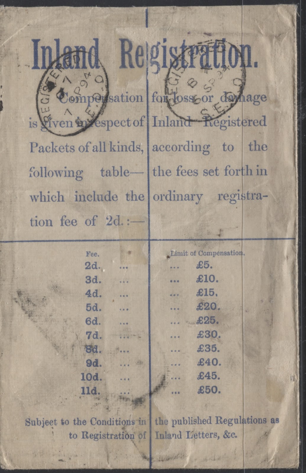 - The front shows the words "Fee Paid" with a period after "paid" and an underline. The back shows the stamp indicta for the basic 2d registration fee, the overprint and a double sided table showing the registration fees and coverage amounts from 2d and £5 to 11d and £50.