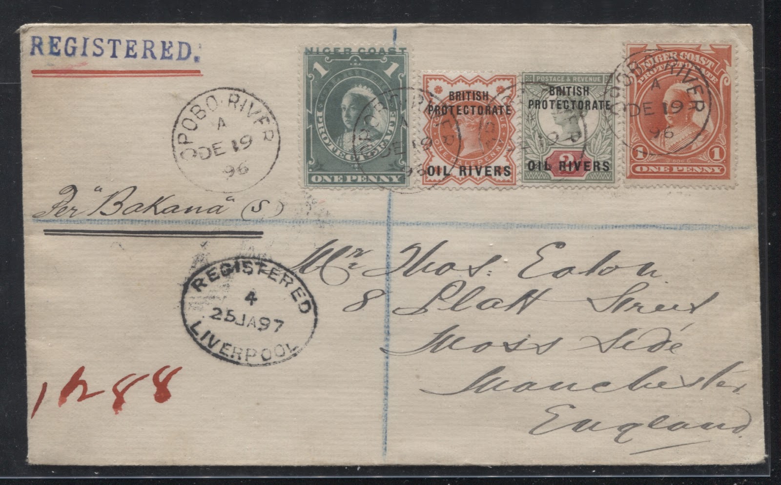 This commercial cover was sent from Opobo River to Manchester on December 19, 1896. The postage of 4.5d indicates that 2d was paid to provide indemnity to the tune of £5. The postage was paid with a 2d and 1/2d of this issue as well as 1d values from each of the next two issues. The backstamp is unclear, but the letters that are readable suggest that it is Manchester. It indicates that the cover arrived on January 25, 1897.