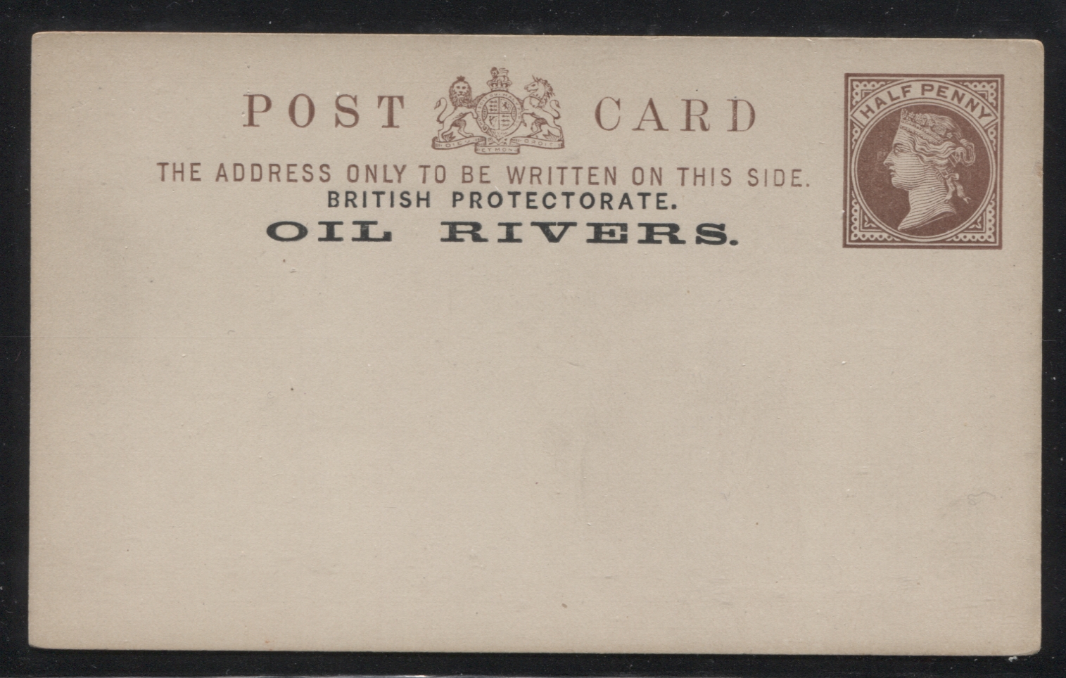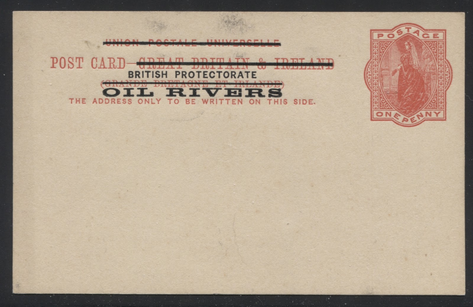 This is a relatively fresh mint example of the 1d foreign rate postcard, bearing the Oil Rivers overprint.
