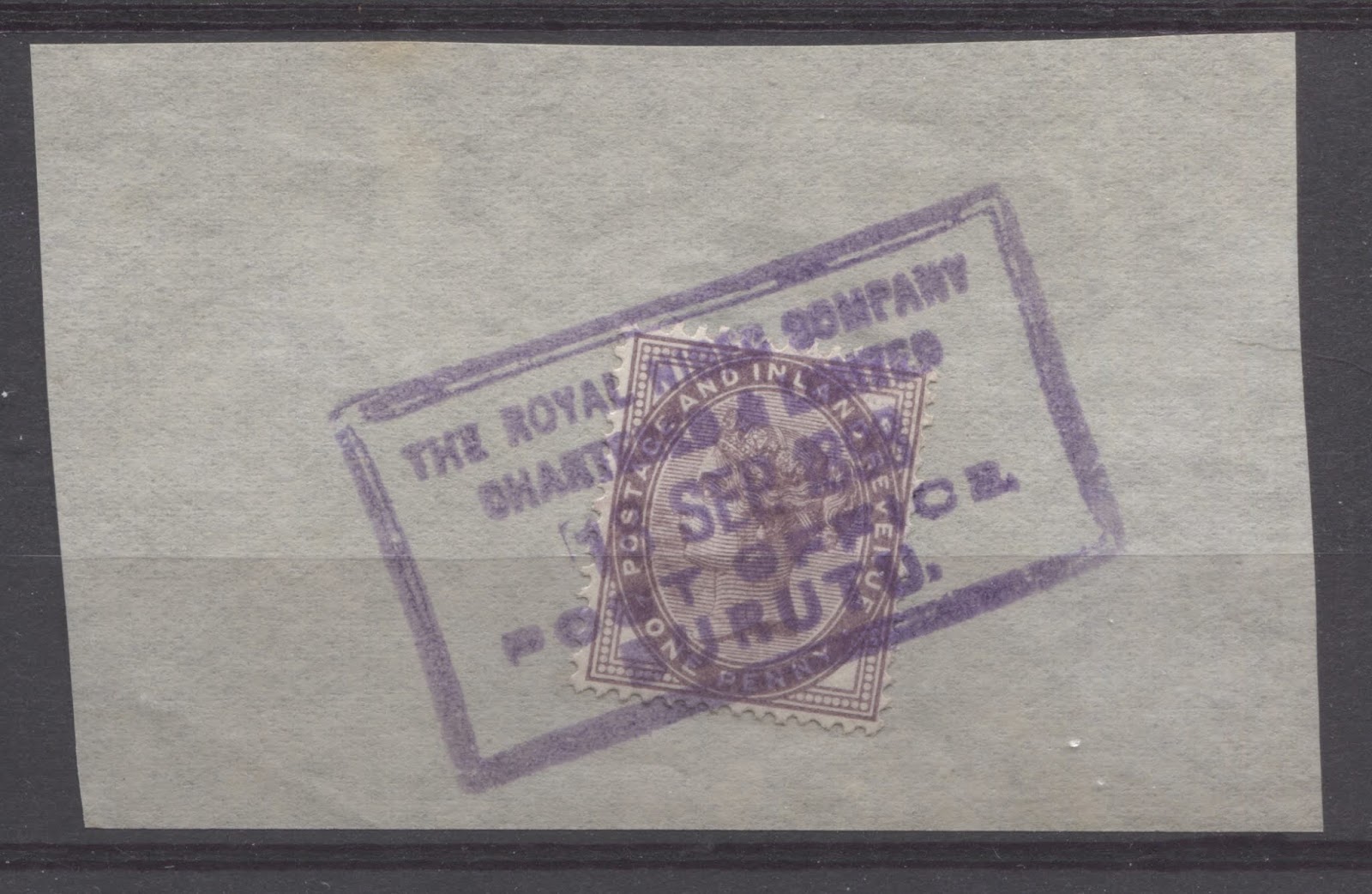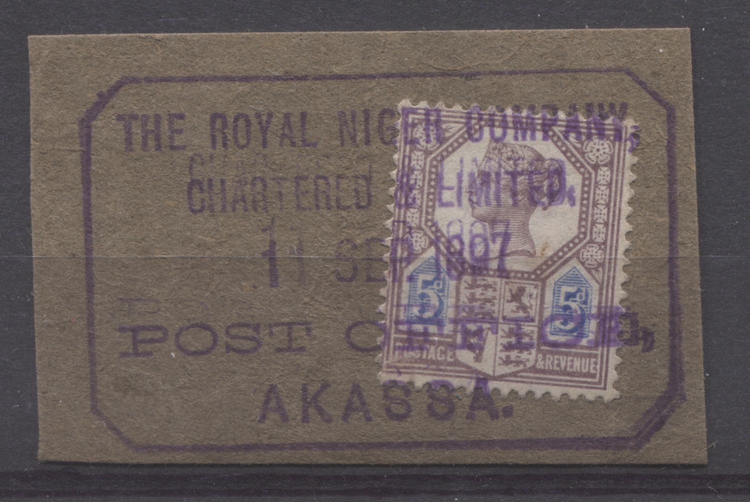 Before the formation of Northern and Southern Nigeria in 1901, the area north of the Oil Rivers Protectorate was known as the Niger Company Territories. Generally, prior to the issuance of the Oil Rivers stamps, stamps of Great Britain, or Postal Stationery items were used. The only way to identify them as Niger Company Territories is by the postmarks, which were generally violet boxed handstamps from Akassa, Burutu, Abutshi and Lokoja. Akassa and Burutu are the most common village names, but that being said, none of these are common by any means. Stamps with the postmarks are scarce enough, but covers and postcards are very scarce indeed.