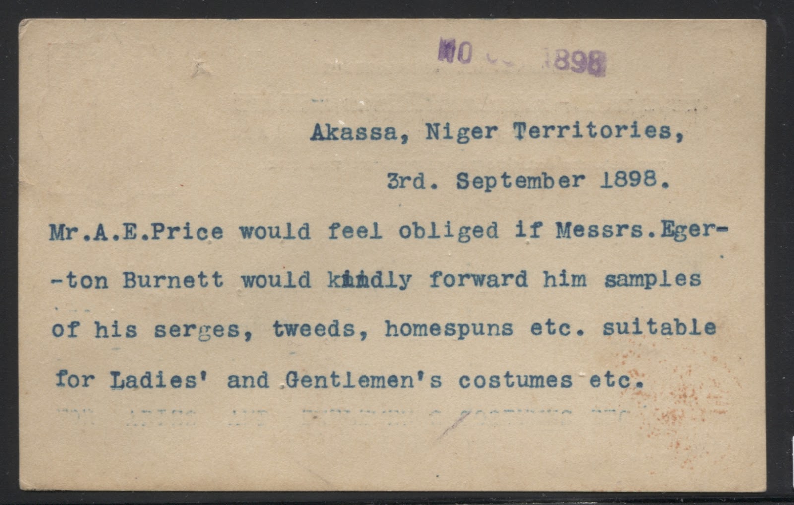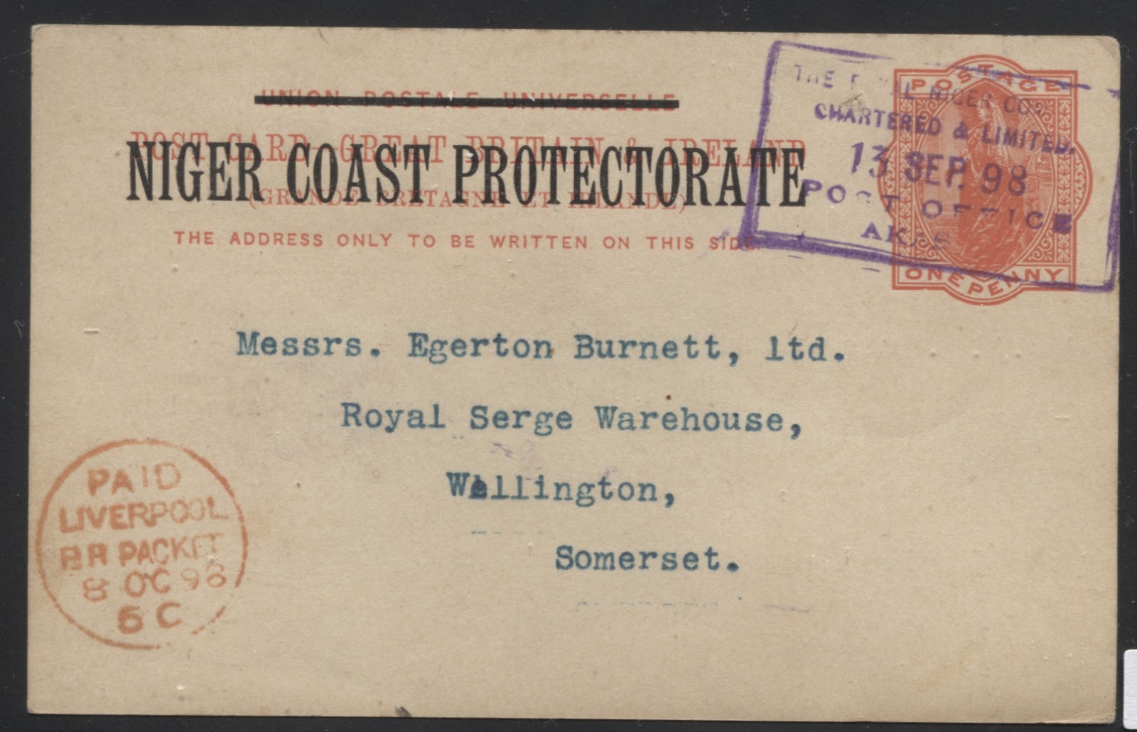 The postcard is clearly a commercial card soliciting samples of merchandise. It is typewritten, which is early for a card mailed in 1898. The card itself is a Great Britain postcard that has been overprinted 'Niger Coast Protectorate", which indicates that it was overprinted after 1894. The territories did not have their own postal stationery, so a Niger Coast Protectorate card was simply used in the territories. It was mailed from the Akassa post office on September 13, 1898, and was received by the Liverpool Packet ship on October 8, 1898. There is no other marking to indicate when it arrived at its destination.