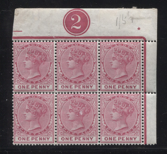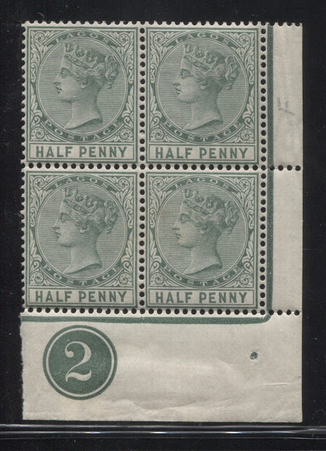 According to Ince, plate 2 was first brought into use for the printings sent out on August 19, 1901, and was used to produce a second printing that was sent out on August 29, 1902. According to him, it was only used to print two printings each of the halfpenny and 1d, as well as one printing each of the 1/- and 6d. However, given that the other values had printings sent out on August 19, 1901, it seems quite likely that the very last printings of the 2d, 2.5d, 3d, 4d, 5d, 7.5d, 10d, 2/6d, 5/- and 10/- were also made from this plate. To settle this question once and for all is the first step in sorting the remaining printings of the Lagos Queen Victoria Keyplates that were made between 1887 and 1903.