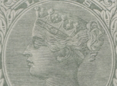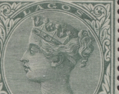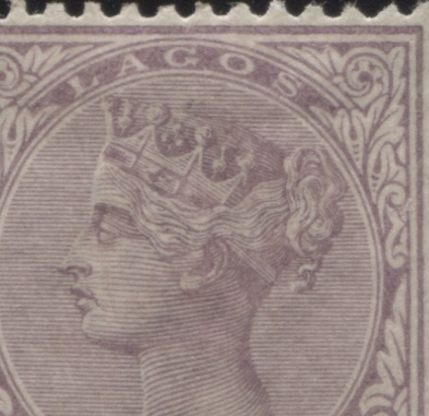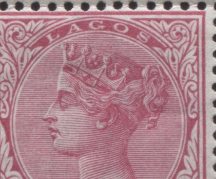 As you can see from this close-up scan, there is some very minimal merging of shading lines at the top of the head, but any and large, the detail is very clear, and is much, much clearer than what would usually be seen from stamps printed in 1893, as evidenced by the fact that it is clearer and crisper than the earliest printings that I examined of the 5d and 7.5d stamps. So there is a very good chance that this is an example of the August 1901 printing made from plate 2.