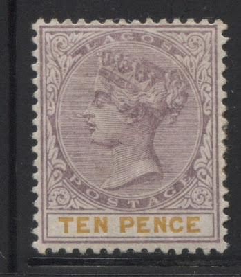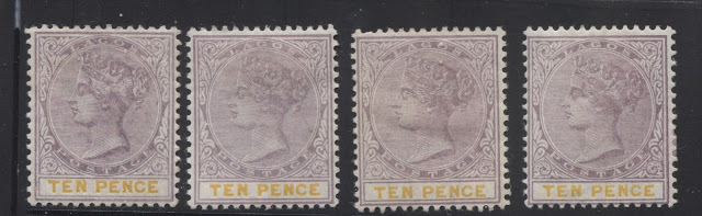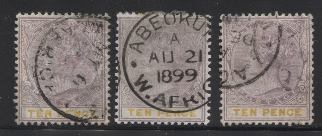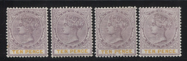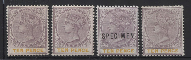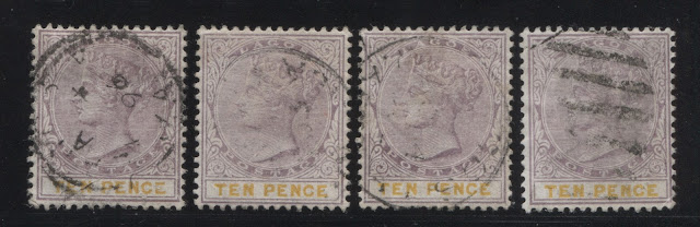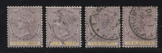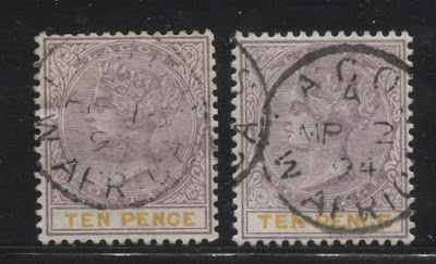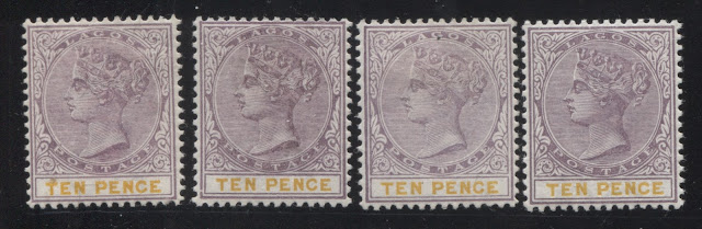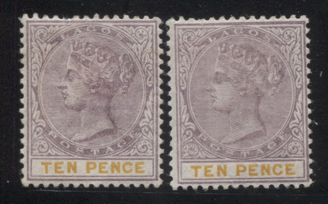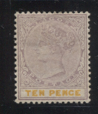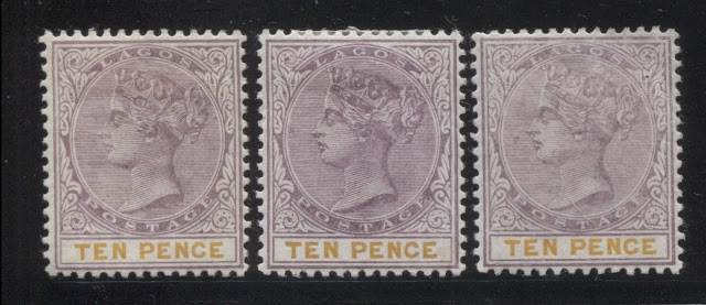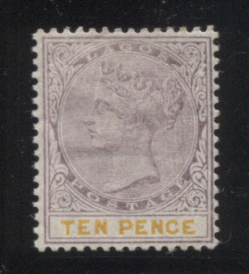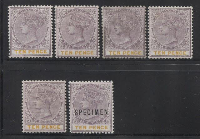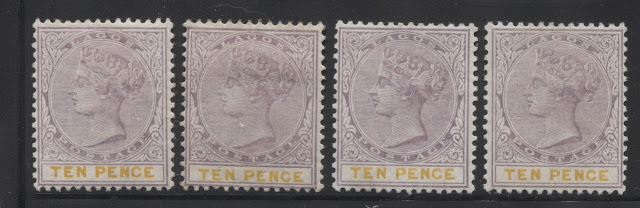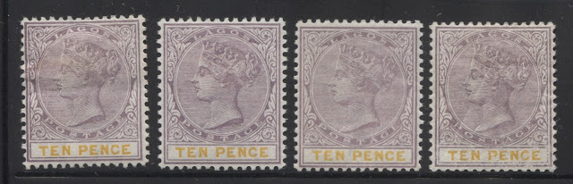 Today's post concludes my examination of the three stamps issued in 1894 by Lagos to facilitate payment of insurance charges on registered parcels: the 5d, 7.5d and 10d. Several weeks ago we looked at the 5d lilac and dark green and concluded that there were approximately 18 printings and then the 7.5d lilac and crimson and concluded that there were 19 printings of those stamps. Given that only 43,380 stamps of the 10d were sent, compared to 55,620 stamps of the 7.5d, and 92,160 of the 5d, I would expect there to have been fewer printings, although it is entirely possible that there were as many printings consisting of fewer stamps each time, just was was the case with the 7.5d. Like the 5d, and 7.5d there were a lot of unsold remainders that were eventually destroyed - 23,100 out of the original 43,380, leaving only 20,280 stamps that were sold and either preserved in mint form, or used.