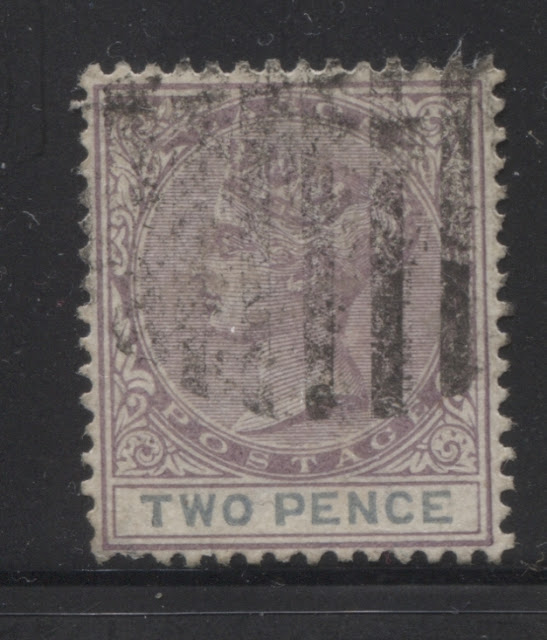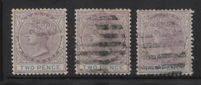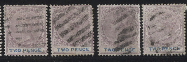 The head plate colour of this printing is also dull reddish lilac. The duty plate colour of this printing is very close to Gibbons's cobalt shade, but is just a touch duller. I have no mint examples and only three used examples as shown above. The cancellation on the first stamp appears to be a 9-bar oval, based on the narrow, widely spaced bars. The other two stamps appear to be canceled with 8-bar ovals.