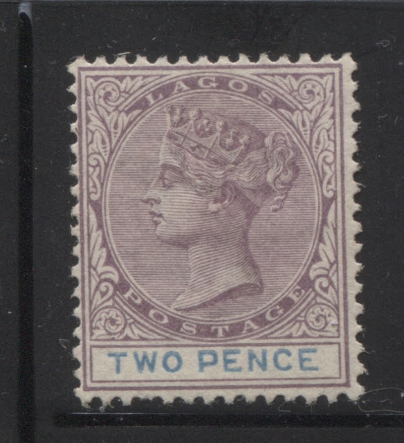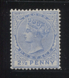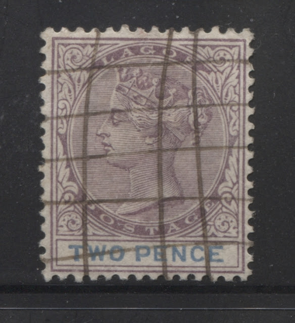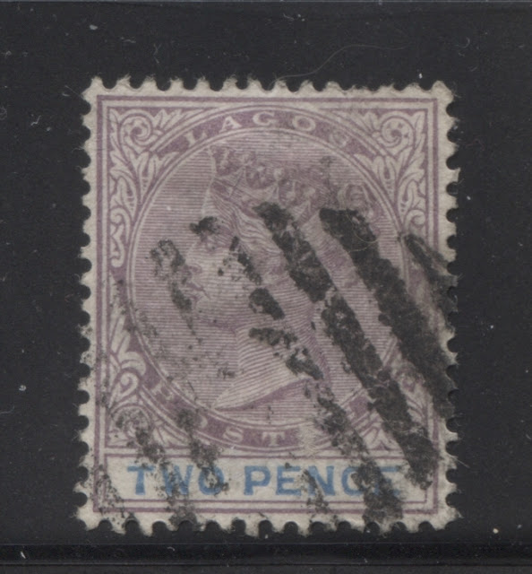 The head plate colour of this printing is closest to Gibbons's deep dull purple, but is just a little bit brighter. The duty plate colour is closest to Gibbons's dull blue, but perhaps just a bit lighter. I only have the used example shown above, with an interesting cross-hatched manuscript cancellation. This is one of the only stamps that I have of Lagos that was cancelled in pen, as this was not a very common means of cancelling stamps in Lagos.
