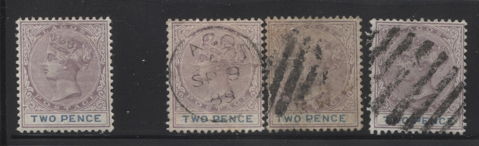 Most of the early printings of this value prior to 1895 in used condition are cancelled with either the 8-bar or 9-bar oval killer. However, after 1895, more and more of the used stamps are cancelled with Lagos CDS cancels, until nearly all of the used examples after 1897 are cancelled in this manner.