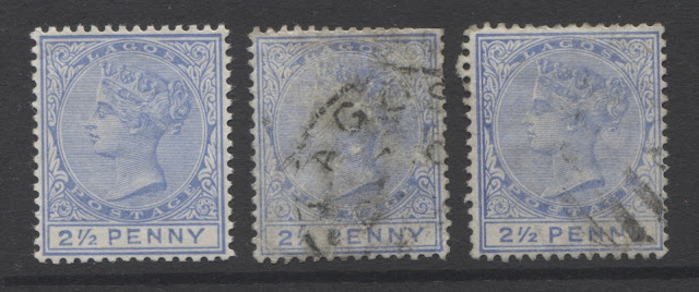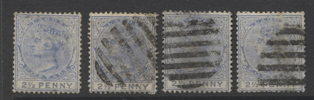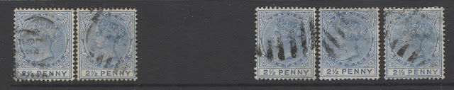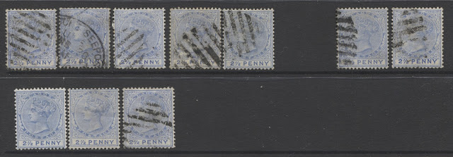 Today's post picks up where I left off last week. I had sorted all of my 2.5d stamps into 71 groups, which was way, way more than the number of printings that were likely made. Given that the stamps were sent to the colony on a quarterly basis and the first printing was issued in April 1891, with the last printing being in August, 1901, there should be approximately 41 printings, as long as each sending included a batch of 2.5d stamps. Because the 2.5d was used to pay the new UPU foreign letter rate per half ounce, it is quite likely that there would have been a separate printing each quarter, to make up the total number of 428,040. This would suggest an average printing of 10,701 stamps each. However, the distribution of examples in the sample that I have sorted, makes it clear that the printings were not done evenly, and that some of the printings are very scarce to rare. Gibbons prices of course are for the most common printings, except for the scarce blue shade, which is from the first two printings made in 1891.