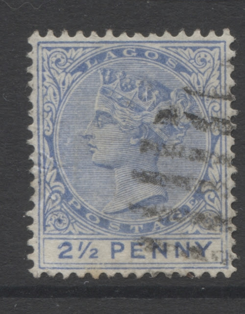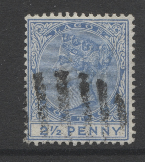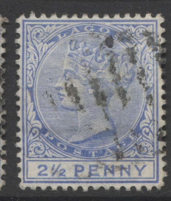 On this printing, the head plate and duty plate colours are still closest to dull ultramarine on the Gibbons colour key, but on this printing the colour is just a bit brighter, being a little bit closer to true ultramarine. I have two mint and seven used examples, all of which are type A. The used examples are mostly canceled with 9-bar oval obliterators, but there is one 8-bar oval as well. There is also an early example of the larger Lagos CDS dated June 29, 1897.