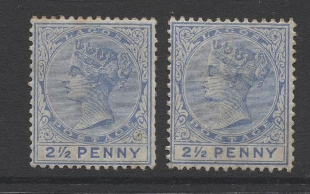 The basic shade catalogued by Gibbons is ultramarine, for both the head plate and the duty plate. However, as we shall see, this is a gross over-simplification, and there are many shades that cover the whole gamut. In addition, there are some printings where the duty plate and head plate colours are completely different, the scarcest of which is the April 1894 printing, which only exists without gum when mint, due to the fact that the entire shipment was stuck together when it was received in Lagos, with the result that the stamps had to be soaked apart.