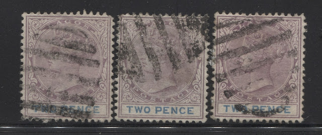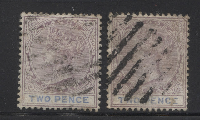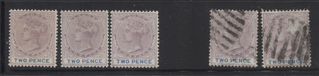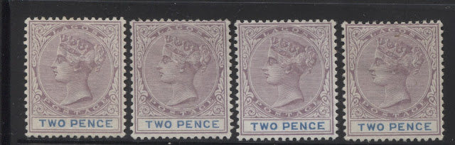 Today's post continues our examination of the printings of the 2d lilac and blue, or in the later printings, the 2d lilac and ultramarine. Last week, I looked at the very earliest printings, made, when the plate had sustained very little to no wear. This week, I start with those printings from the next state of the plate, in which the very first signs of wear begin to appear in the form of the merging of the first few hairlines at the top of the head, and a loss of detail in the hair at the back of the head. Most of these printings had duty plate shades, which are still in the blue and cobalt range, rather than the ultramarine range.