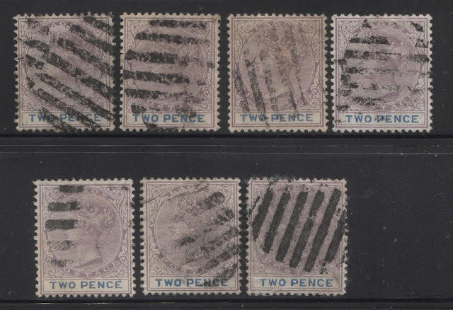 It would appear that all but two of these examples, being the third stamp from the left in the top row, and the right stamp on the bottom row, are cancelled with strikes of an 8-bar oval obliterator. The other two stamps are cancelled with strikes of a 9-bar oval obliterator.