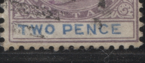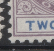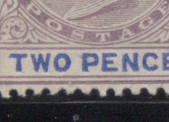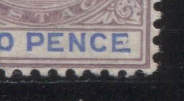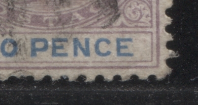 This printing shows a good example of a constant variety that occurs on all sheets of all 2d stamps, starting with those issued in 1874. It consists of a small mark, resembling either a comma, or accent that is opposite the middle bar of the "E" of Pence. It is not rare, as it occurs on several stamps in a sheet. I'm not sure of exactly how many, but it was not every stamp on the sheet, but perhaps 5% or so, would be a good estimate. Here is a close-up scan of what it looks like on this stamp: