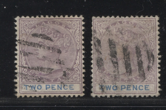 I have the above two used examples only, both of which are cancelled with what appears to be the same Proud type D3 May 1898 Badagry CDS. This is a reasonably scarce cancel, which is rated by Proud, to be 30x scarcer and more valuable than the more common Badagry cancels.