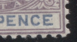 Another variety, which may well be constant is the frame break under the "N" of Pence. In fact, I'm fairly certain that I came across an inner frameline break at approximately the same place on the 2.5d value, which would suggest that it is indeed constant. Here is a close-up scan: