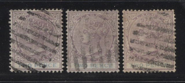 On this printing, the head plate colour is closest to Gibbons' dull purple, but is just a touch brighter. The stamp on the right is both brighter and paler, but this may be affected by soaking. I've grouped it here because the duty plate colour matched the other two stamps. The duty plate colour is an almost exact match to Gibbons's cobalt.