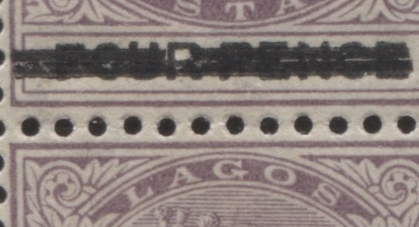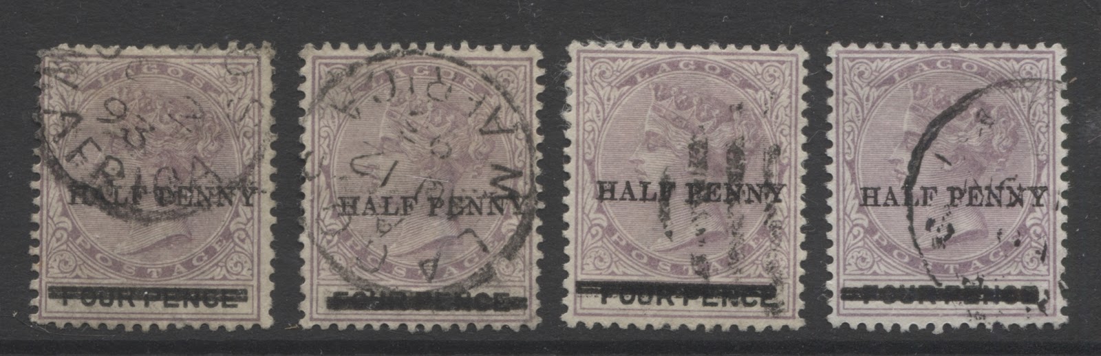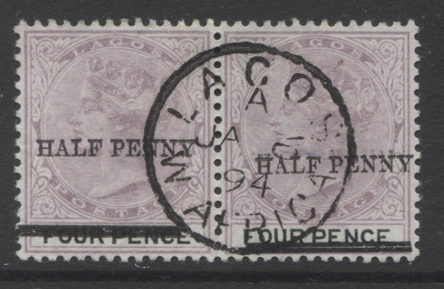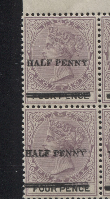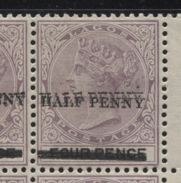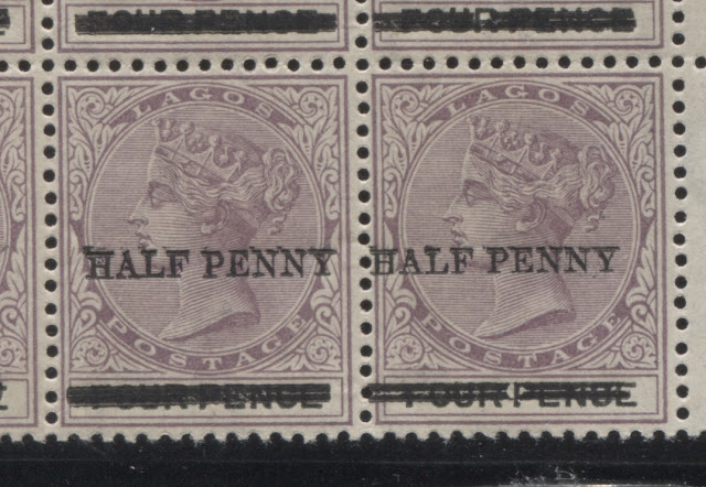 Last week I looked at the printings made from the third state of the plate, for the 4d lilac and black Queen Victoria Keyplate stamp of Lagos. This week, I am going to segue a bit and look at the half-penny provisional overprint, which appeared in August of 1893. By way of background, the quantity of halfpenny stamps that were sent to the colony in 1893 was badly mis-judged to the point where, by August 1893, there was a severe shortage of half-penny stamps. So, to alleviate the shortage, over the next six months or so, a quantity of 4d stamps were surcharged with the words "Halfpenny". According to Pemberton, a well known philatelist from the 1930's there were six separate printings of the surcharge, which were made over the six month period before fresh supplies of the halfpenny were received from London. So it is quite likely that there was one printing per month from August 1893 until about February 1894. The total quantity of stamps surcharged is not known with certainty, but it has been suggested in Ince's work that it was approximately 20,000 stamps. What is also not known is which printings were used for the surcharge.