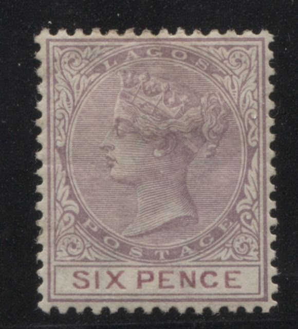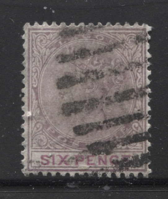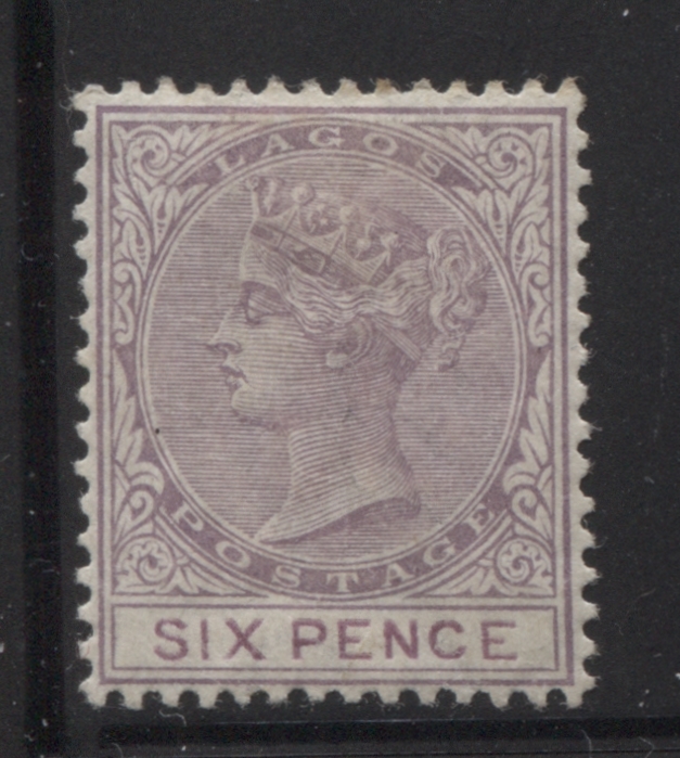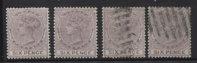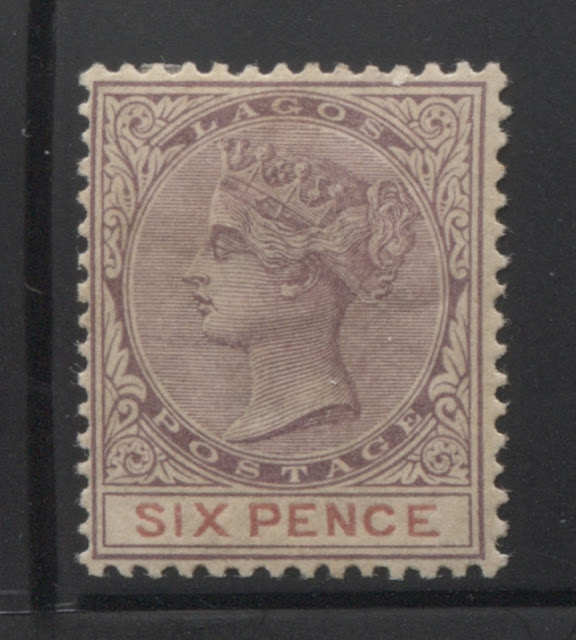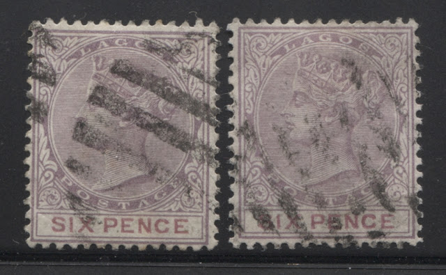 This week I move on to the next value in the 1887-1903 Crown CA issue of Lagos: the 6d lilac and mauve. This stamp was first sent to the colony on March 31, 1887, along with the others. The last printings from plate 1 were sent on August 4, 1900, which is a full year earlier than many of the other values from this issue. 86,340 stamps were printed, and 23,400 remainders were sent back to London in 1905. A good number of these would have come from the plate 2 printing, which was made in mauve and aniline carmine. This last printing of this value was, according to Gibbons, made in October 1902. However, the number produced for this printing is not known.