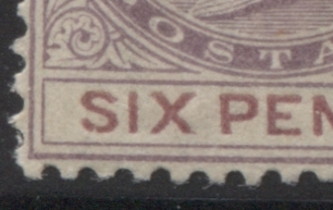 The mint stamp at the lower left above shows the "broken S in Sixpence", which is a constant flaw, in which there is a small nick in the bottom of the "S". An enlarged scan of this is shown below.
