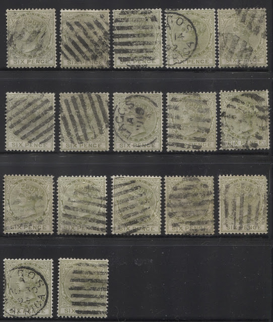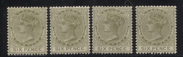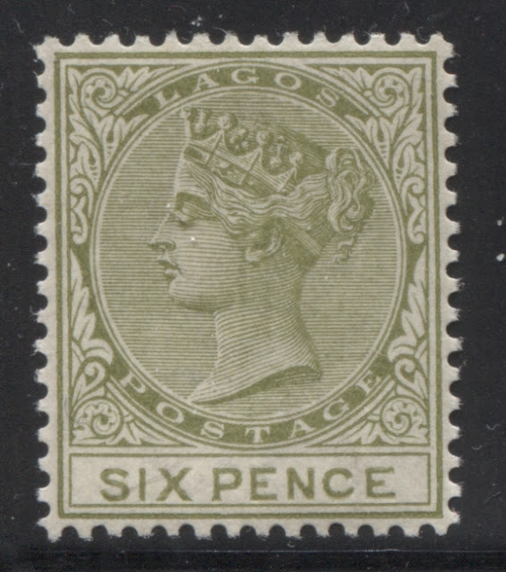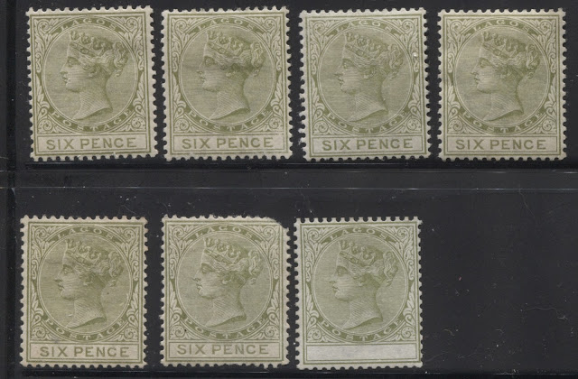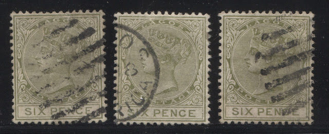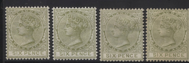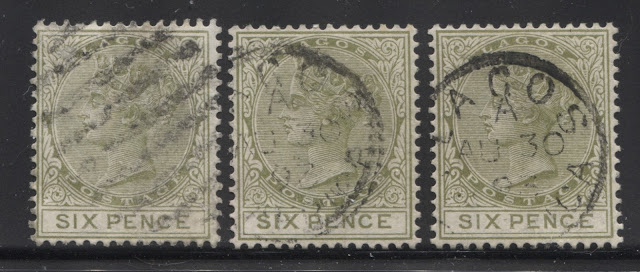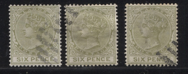 Today's post will pick up where last week's post left off with how to distinguish the six printings of the 6d olive green definitive of Lagos that was in use between 1884 and 1887 when it was replaced by the bi-coloured mauve and claret definitive stamp.