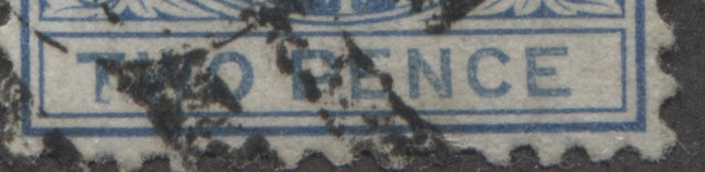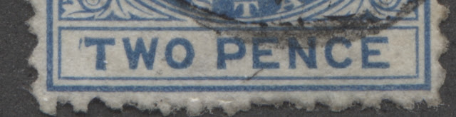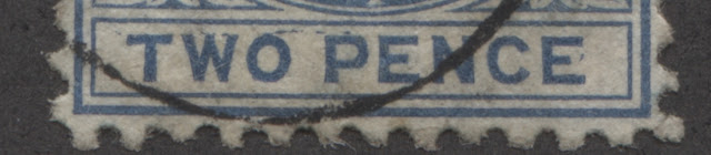Because the duty plate was printed separately from the key plate, there are often instances where the colour of the inscription differs from the colour of the rest of the stamp. This becomes critical to identifying the different printings. Below are two scans of two printings of the 2d blue, which show how different these colours can be: