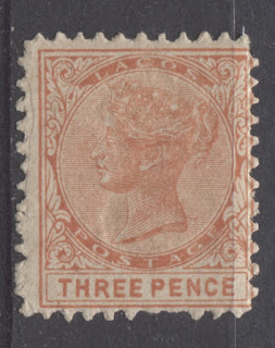 The key plate used for all issues up to 1901 was plate 1, and the stamps were printed in sheets of 60 being laid out in 10 horizontal rows of 6 stamps. The sheet margins of the sheets bore no jubilee border lines, but the key plate #1 was printed in white on a ball of colour located both above stamp #2 and underneath stamp #59 in the sheet. In addition, the "current number" was printed in colour in a white oblong with voided corners, above stamp #5 and under stamp #56. I have only ever seen these on the later issues. In fact the earliest issue I have with these marginal markings like this is the first Crown CA issue of 1882. The current number is interesting. Many collectors misinterpret this as a plate number, when it is not. What it actually represents is the order in which plates were laid down since 1861, regardless of country. In 1874 each colony was allocated its own sequence of numbers, starting from number 1 in each case. Thus for these issues, we would expect the number to always be "1", though a different number would signify the existence of more than one plate. This system was eventually abandoned, but continued in use until the mid 1890's.
