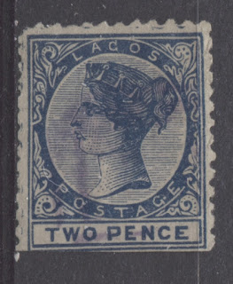 Occasionally one will come across a stamp like the one shown above where a manuscript marking is visible in conjunction with the cancel. It could be easily dismissed as a fiscal marking or pen cancellation. However another explanation is more plausible. J.F Ince, in his work titled "The Postage Stamps and Postal Stationery of the Colony of Lagos 1874-1906" suggests that these were the initials of the original owners of the stamps. He goes on to discuss how in the Falkland Islands there was a system whereby a person or firm that was far away from a post office could send unfranked mail to the office that would then frank the mail with stamps that they held on account for the person or firm. In order to avoid mixing up one person's stamps with another, the stamps were marked with a manuscript letter or set of initials. He goes on to express doubts about the plausibility of this theory as it relates to this issue on the grounds that the only examples he saw were marked with the letter J. However the above example is not the letter J, and I have other examples with different letters. I am convinced that his theory is correct and that these represent ownership markings. In light of the overall scarcity of the basic stamps, these must be quite rare in reality.