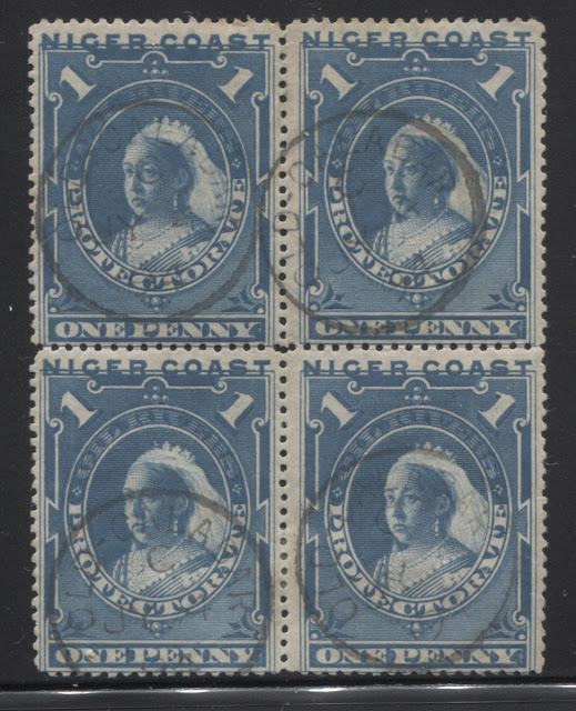 A nice block of the 1d deeper blue used at Old Calabar River on July 4, 1894.