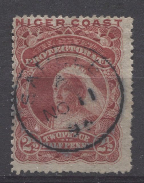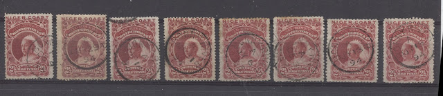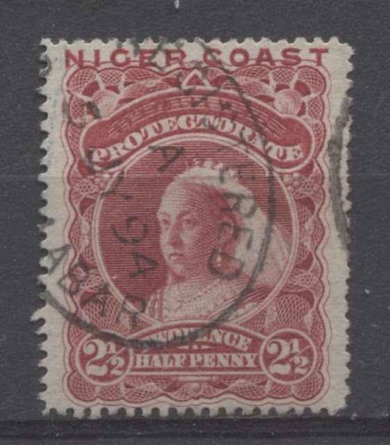 The scans below show the cancellations I have on this stamp. In contrast to the other stamps, where Old Calabar River and Old Calabar were the most common cancellations, it is Bonny River that is the most common. It is on this value that I have my first example of a CDS postmark from Sapelle.