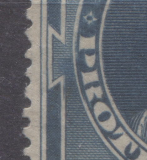 This is similar to the the above, except that in addition to a line from the E towards the R, there is also a line from the "R" back towards the "E", and it almost looks as if these join up. This particular example is especially nice as it occurs on a well centered stamp that has a compound perf, and is cancelled at Sombriero River, at an early 1894 date.
