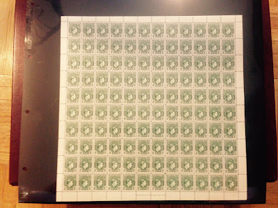 The early sheets of 120 bore no plate numbers and no sheet numbers as shown above for this 1942 printing of the 1/2d. They did bear a single inscription which read :Bradbury Wilkinson & Co. Ltd. New Malden, Surrey, England.". This inscription extended across the four middle stamps in the sheet, covering the selvage of the middle two, and extending just into the outer two of the four stamps. Later sheets bore a plate number in an italic number underneath the second last stamp. These numbers could be either a single number, or a number and alphabetic suffix, such as 1, 1a, 1b. As far as I know there is no "c" suffix, and no comprehensive sheet studies have been completed to identify all the existing plate number combinations that are possible. The sheets of 60 will usually be found folded, as they are taller than any sheet album or sheet file on the market today. Some of the sheets can be found with black sheet numbers printed in the margin just to the right of the last stamp in the top row, or they can be found with the number printed just above this stamp.