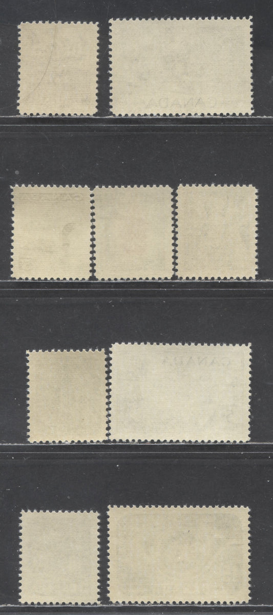 Canada #337v, p 1c Light Violet Brown & Reddish Chocolate Queen Elizabeth II, 1954-1962 Wilding Issue, 9 VFNH Singles All DF1 and DF2 On Vertical Ribbed Paper, Various Shades, Semi-Gloss & Satin Cream Gum, Winnipeg Tagged & Untagged
