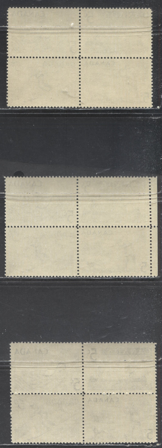 Canada #368a 5c Deep Ultramarine Skiing, Canoeing, Swimming & Hunting, 1957 Recreational Sports Issue, 3 VFNH Se-Tenant Blocks of 4, Horizontally Ribbed, LF, DF & NF Papers, Streaky Cream Semi-Gloss Gum