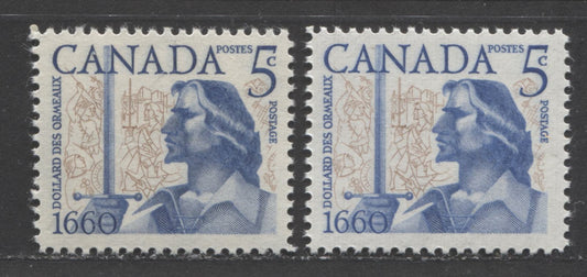 Canada #390var 5c Brown & Dark Blue Dollard Des Ormeaux, 1960 Battle of Long Sault Issue, 2 VFNH Singles Significant Downward Shift Of Vignette, NF Vertical Ribbed Paper, Two Shades