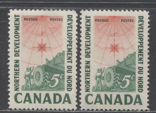 Canada #391var 5c Deep Emerald & Red Surveying Crew, 1961 Northern Development Issue, 2 VFNH Singles Major Leftward Vignette Shift, NF Ribbed Paper