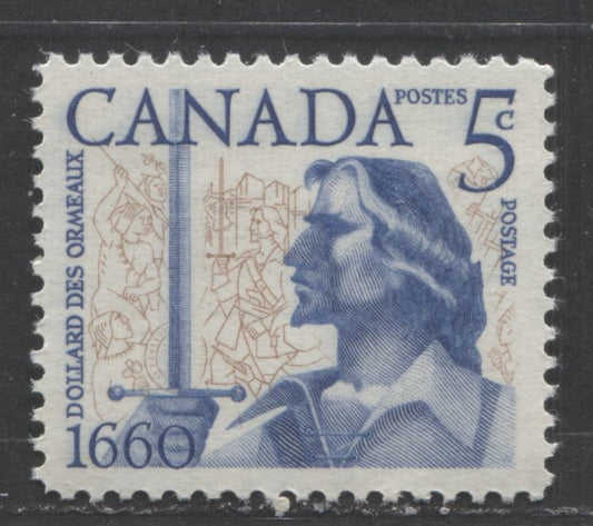 Canada #390var 5c Brown & Dark Blue Dollard Des Ormeaux, 1960 Battle of Long Sault Issue, A VFNH Single Significant Downward Shift Of Vignette, DF Smooth Paper
