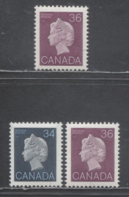 Canada #926, 926A 34c & 36c Dark Blue & Plum Queen Elizabeth II, 1985-1987 First Class Definitives, 3 VFNH Singles On DF Harrison Paper With Deep Yellow & Greenish Yellow Tags