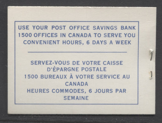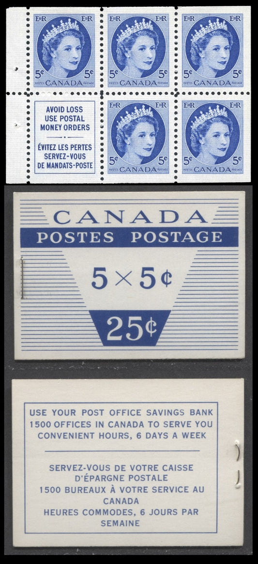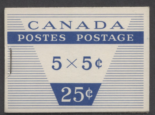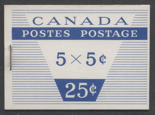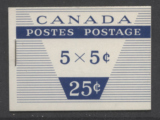 Canada #BK49mvar 1954 Wilding Issue, A Complete 25c Bilingual Booklet Made Up Of 5c Blue, One Pane Of 5+Label, Type II Cover With DF Smooth Paper, 12mm Staple, Back Cover Is DF With Very Sparce LF Fibers