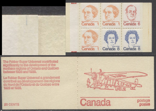 Canada #BK74avar, 1972-1978 Caricature Issue, A Complete 25c Booklet, Dead Nieuport Scout Cover, Smooth DF/DF Grayish, Vertical Hairline Tag Streaks Down 1/3, 2/2 And 2/3