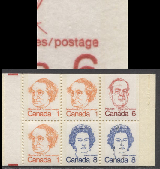 Canada #BK74kivar 1c, 6c, 8c Pale Orange - Royal Blue John A. Macdonald - Queen Elizabeth II, 1973-1978 Caricature Issue, A VFNH Complete Booklet HB10 Cover, NF Pane, Clear-Sealer, Re-Entry In "GE" Of "Postage"