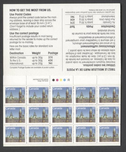 Canada #BK97a 1988 Parliament Buildings Issue, A 37c Multicolored Booklet, MF-fl Cover, Coated Harrison Paper, Outside Cover Stamp Pack, Inside Cover Pay Your Bills, AP Printing, Perf 13.3 x 14