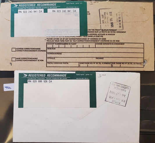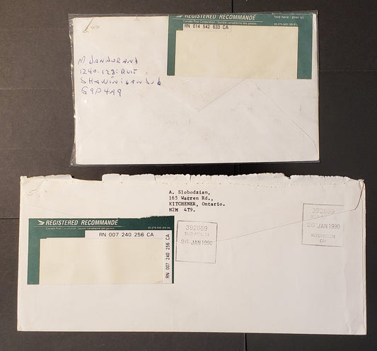 Canada #1155-1157, 1159, 1172, 1181-1182 $1-$2 High Value Definitives, 1988-1992 Mammal and Architecture Issue, Combination Use on Two Registered Domestic Covers